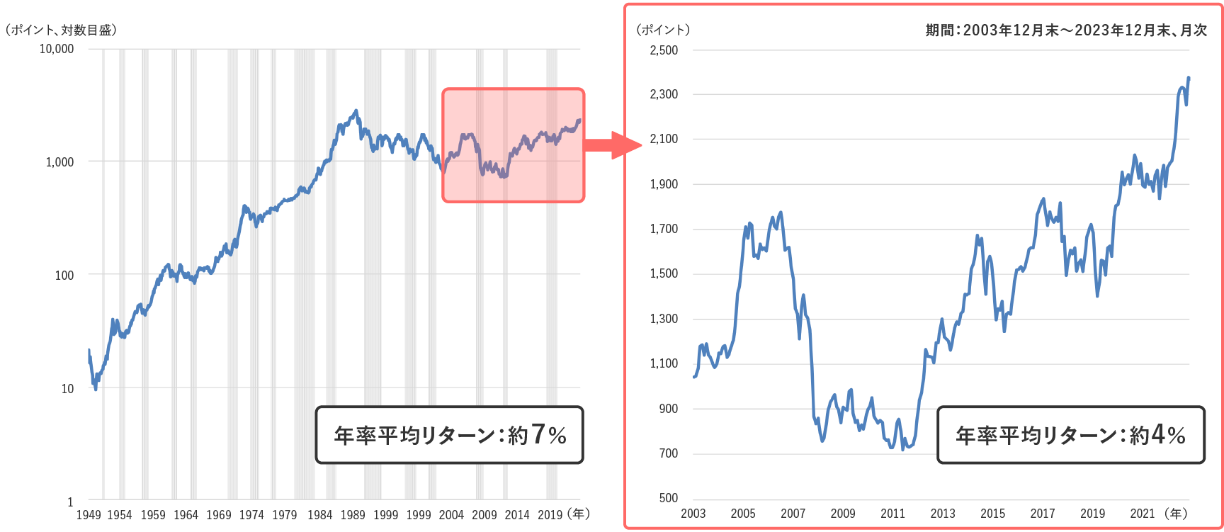 左のグラフは算出可能な1949年からの推移を示しています。約75年間で110倍を超える上昇で、年率平均リターンは約7%でした。次に右のグラフは過去20年間を示していますが、約2倍に上昇し、年率平均リターンは約4%でした。