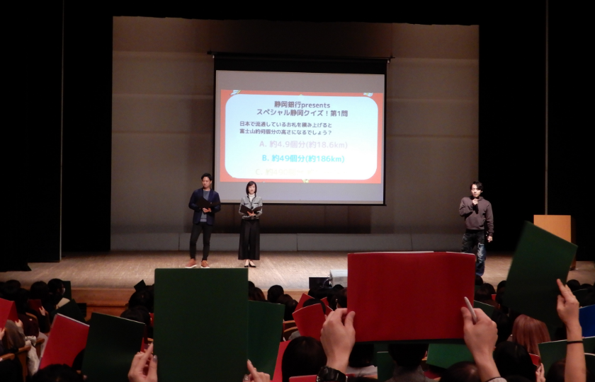 はじめに、静岡銀行のお二人より、静岡県にちなんだお金のクイズが出題されました。なかにはNISAに関するユーモアあふれるクイズも出題され、会場は大いに盛り上がりました。
