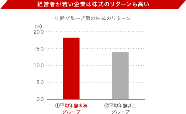 年齢が若い経営者は、一般的に退任までの時間が相対的に長いため、長期目線での経営を行ないやすいと考えられます。そのため、成長への投資や、新しいビジネス機会への挑戦、構造改革などによる企業体質の改善を積極的に行ないやすいと考えられ、それが企業の業績の成長に繋がっているのかもしれません。
