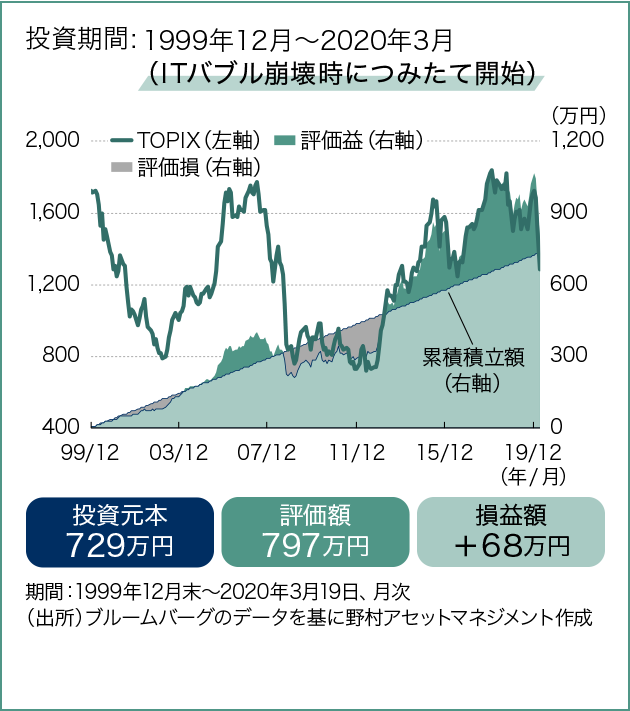 2000年代前半のITバブル崩壊時に株価のピーク(下落しはじめた時)から、下落前の株価を回復するまでの間、『つみたて投資』をしていたら運用結果はどのようになっていたでしょうか?3つの投資対象(日本株、外国株、米国株)について調べてみました。